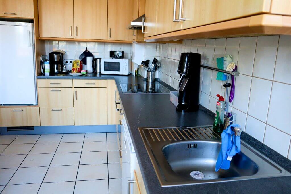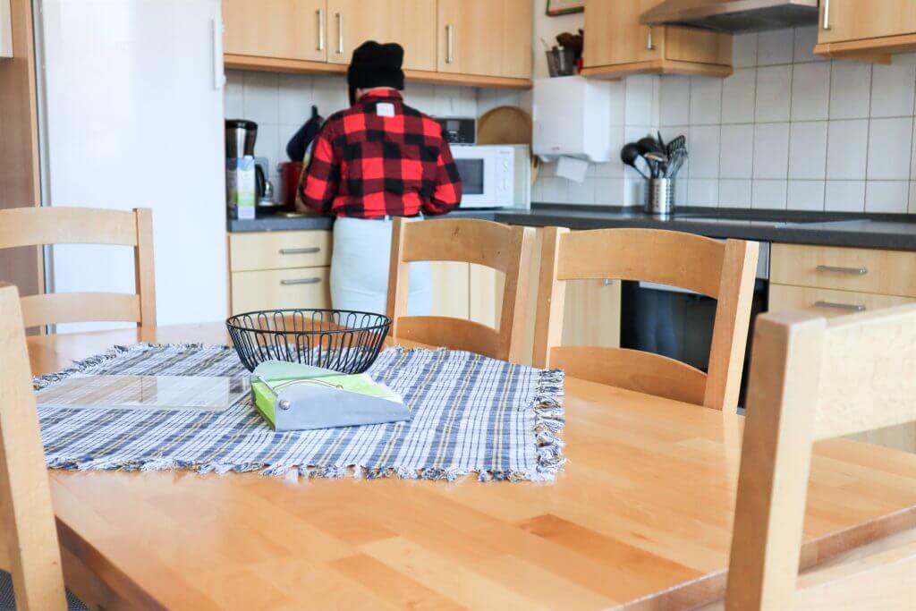 Das von den Hauswirtschafter*innen täglich frisch zubereitete Essen wird in Kleingruppen je nach Tagesablauf im Gemeinschaftsraum oder in der Küche gegessen. Die Wäsche wird direkt im Keller der Wohngruppe gewaschen.