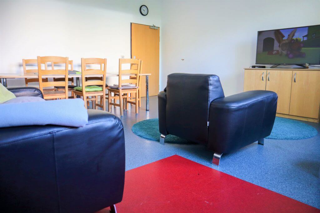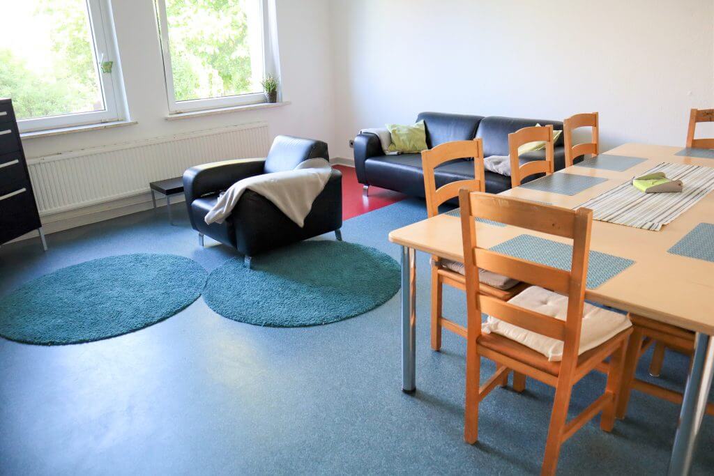 Uns ist es wichtig, dass alle Bewohner*innen ihre eigenen sicheren Rückzugsbereiche haben. Daher können die Einzelzimmer individuell eingerichtet werden. Die neun jungen Menschen verteilen sich auf alle drei Etagen. Ihnen stehen mehrere Badezimmer und Gemeinschaftsräume sowie zwei Küchen zur Verfügung. Die Gemeinschaftsräume werden gerne genutzt, um gemeinsam zu spielen oder fernzusehen. Im großzügigen Außenbereich befinden sich ein Spiel- und Fußballplatz, auf dem sich die Bewohner*innen austoben können. Auch ein Grillplatz lädt im Sommer zu gemeinsamen Festen ein.